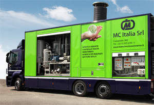 MC ITALIA ha realizzato un AUTOMEZZO SPECIALE PER ASPIRAZIONE POLVERI (certificato ATEX), autonomo relativamente alle utilities, dotato di gruppo elettrogeno, aspiratore, compressore, pompa da vuoto con impianto (ATEX) per insaccamento diretto di polveri in big bag. Sfruttando questa tecnologia, siamo in grado di aspirare e insaccare fino a 45 mc di polveri al giorno.